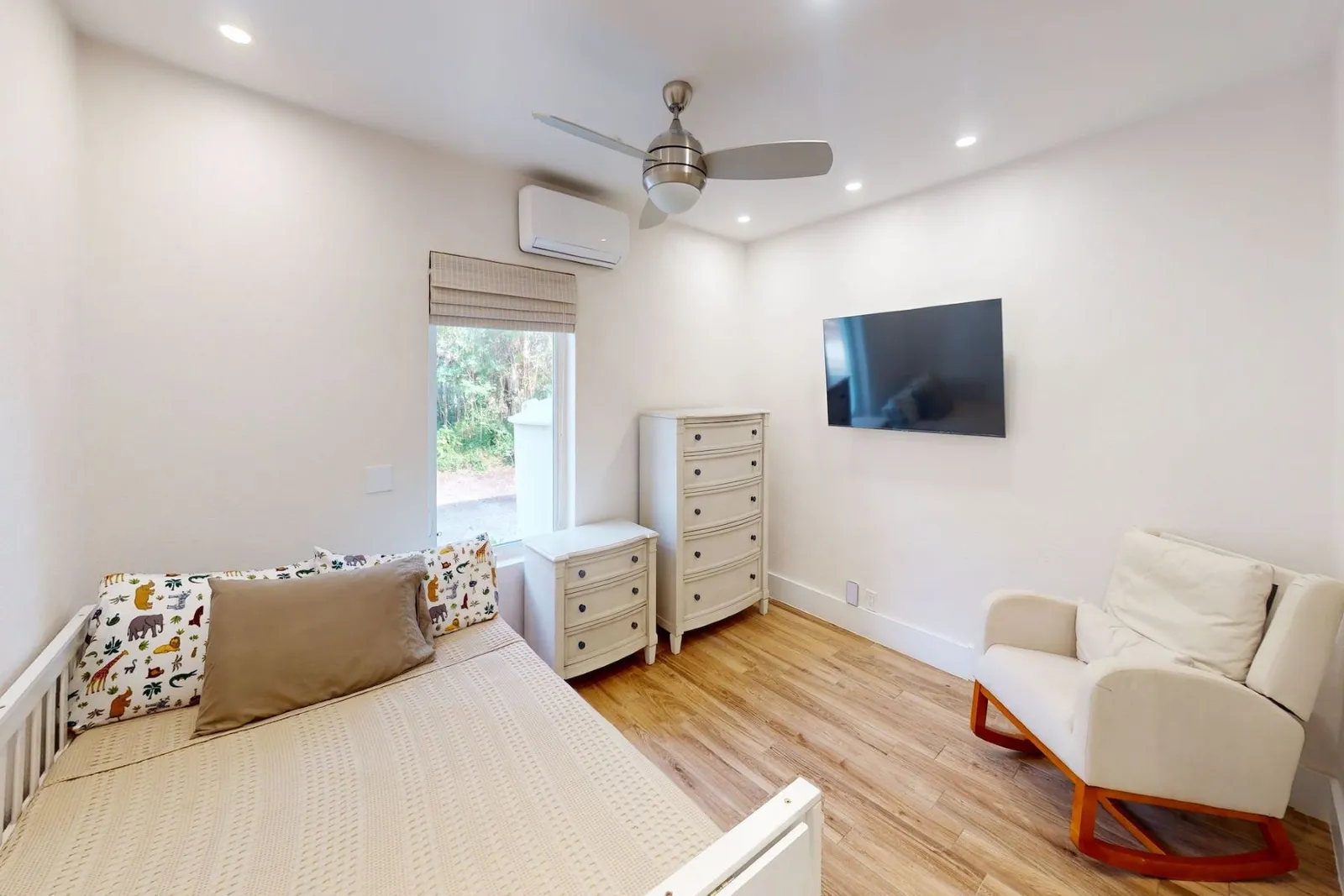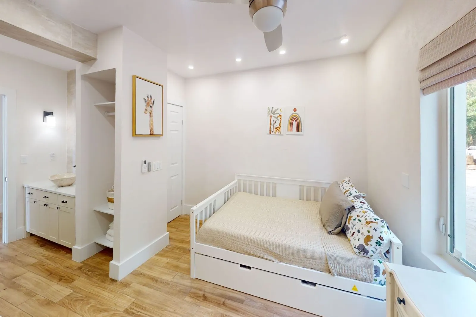 Standard – 52 inches long x 28 inches wide (132cm x 71cm), sheets provided, room-darkening shades in room